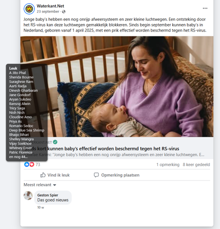 Sinds begin september kunnen baby’s, geboren vanaf 1 april 2025, met een prik effectief worden beschermd tegen het RS-virus. Voor baby’s kan het virus leiden tot een ernstige ontsteking van de kleine luchtwegen of een longontsteking, waarvoor ziekenhuisopname vaak onontkoombaar is. Veel ouders weten of wisten niet dat bijna alle kinderen voor hun tweede verjaardag een RS-virusinfectie krijgen. Vaak lijkt het op een gewone verkoudheid en zijn ze snel weer beter. Maar bij een paar duizend baby’s per jaar is de luchtweginfectie dusdanig ernstig dat ze in het ziekenhuis moeten worden opgenomen.
